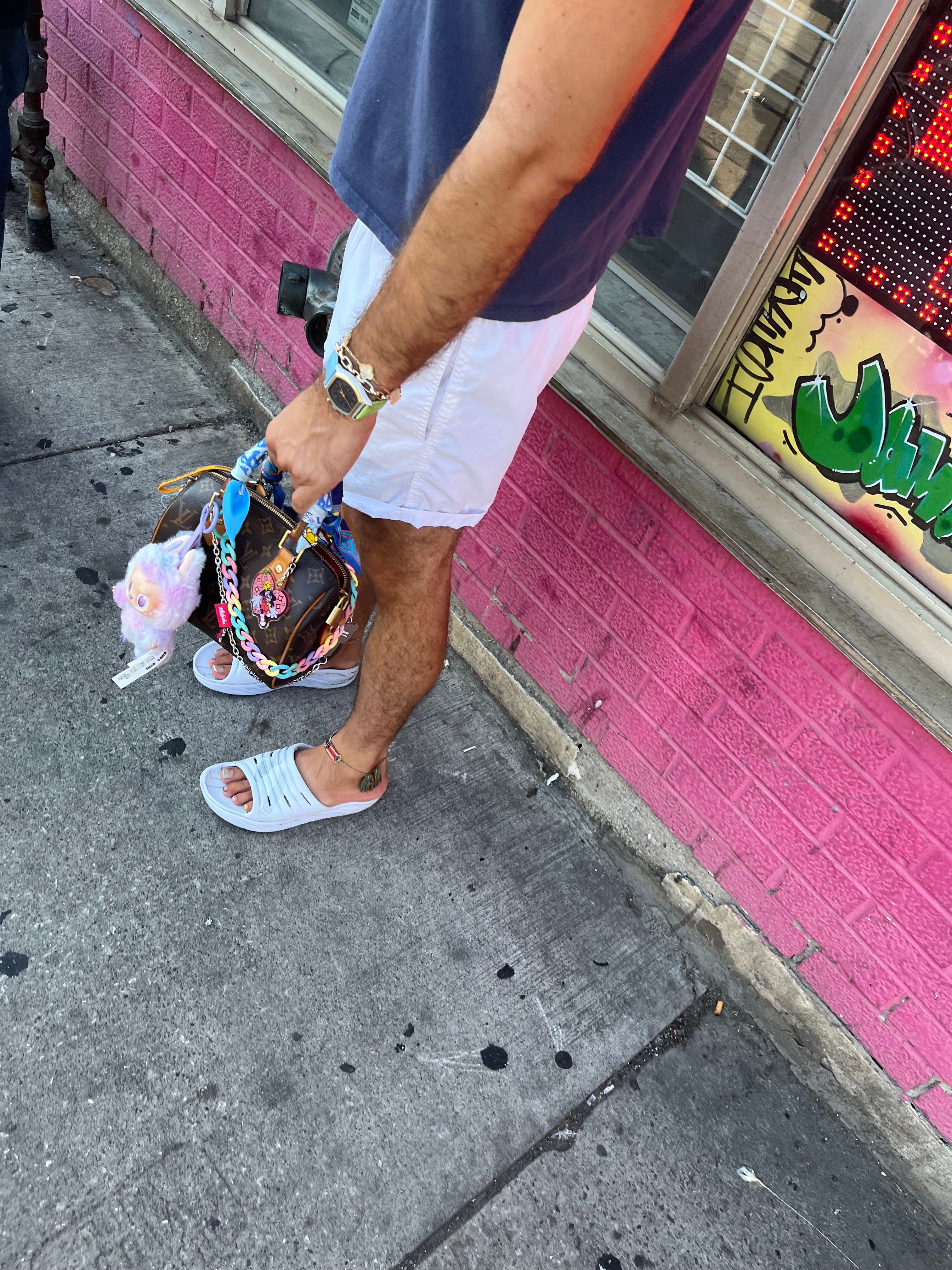 Below: mini LV monogramed handbag with rainbow plastic chain, scarf-wrapped purse strap and pastel Labubu.
