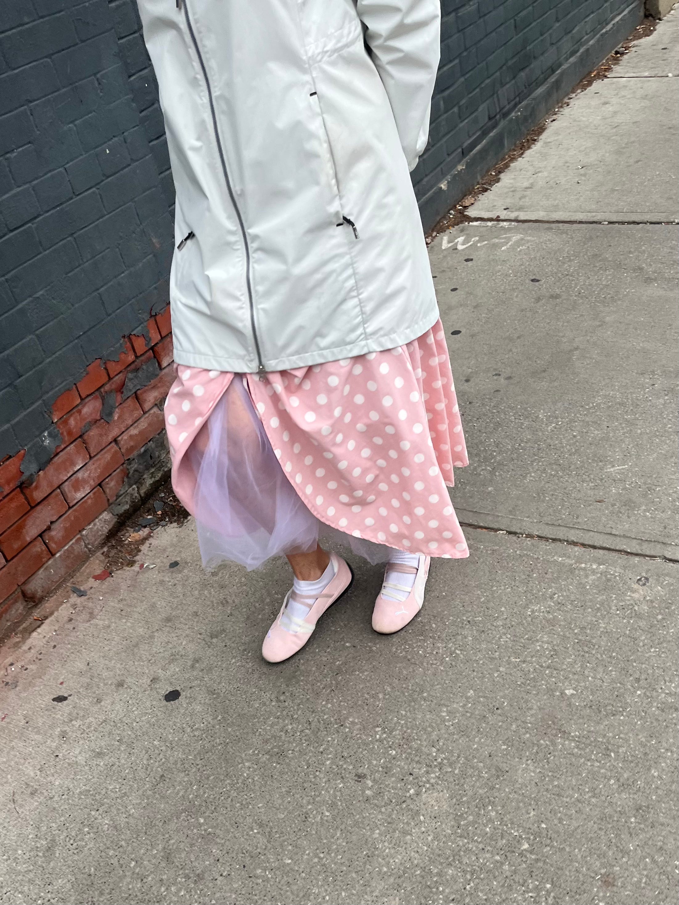 It has been a polka dotted summer. When I snapped this pic (below), I fell in love with this tulle x raincoat x polka dot skirt combo (and the stylish older lady with a white head of hair who was wearing it). Plus, the pink puma speedcat ballets are cute too. But polka dots have been all in over the place. In bag-form, I’ve been loving this Nina Bow bag and this A Bronze Age tote (shoutout Emma).